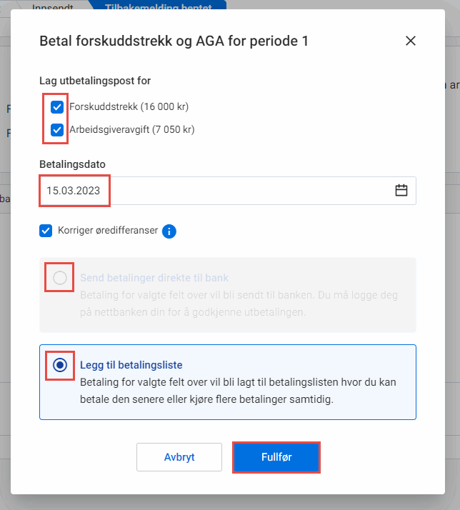 For å kunne betale forskuddstrekk og arbeidsgiveravgift forutsetter det at status periode er enten mottatt eller mottatt med retningslinje.
