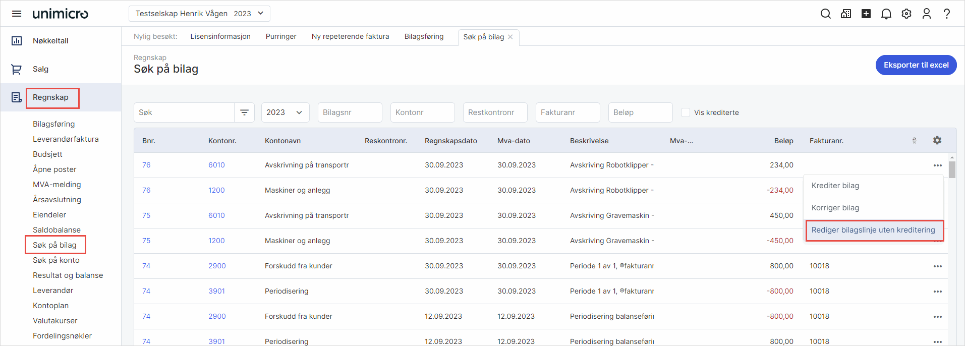 2. Klikk på de tre kulepunktene tilhørende bilagslinjen du ønsker å redigere, og velg Rediger bilagslinje uten kreditering.