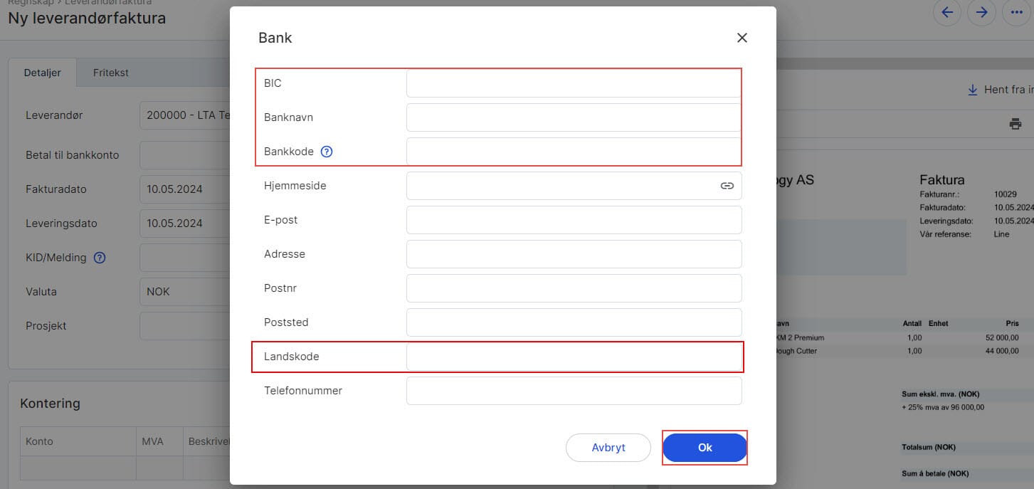 5. Fyll ut feltene BIC (Swift), Banknavn, Bankkode og Landskode (tobokstavs ISO-kode). Informasjon tilknyttet disse feltene kan variere mellom land og banker.