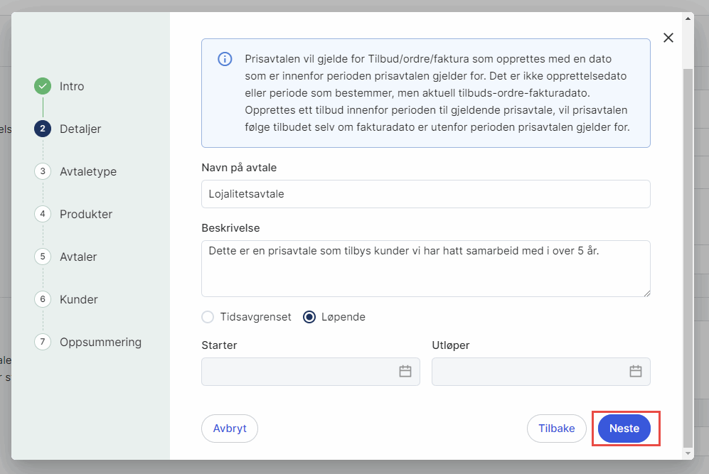 2. Detaljer: Sett navn og beskrivelse på avtalen. Velg om du ønsker en Tidsavgrenset eller Løpende. Velger du førstnevnte må du angi start- og sluttdato i påfølgende felt. Klikk på Neste.