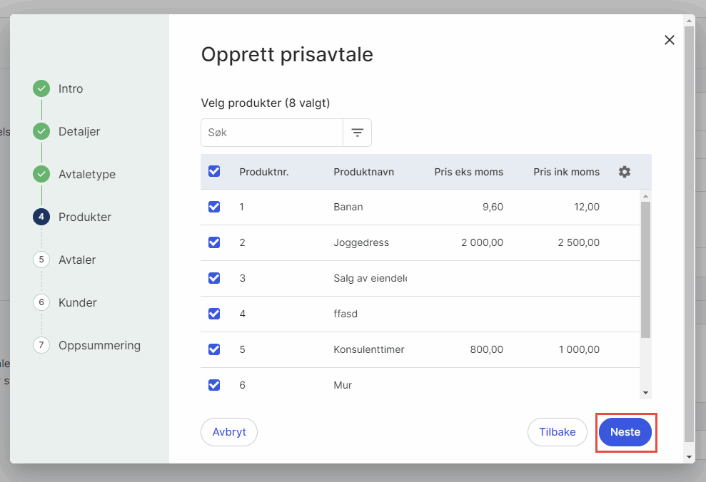 4. Produkter: Sett hake ved de produktene du ønsker prisavtalen skal gjelde for og klikk på Neste.