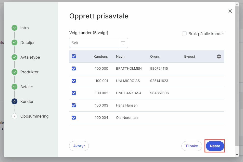 6. Kunder: Sett hake ved de kundene du ønsker at prisavtalen skal gjelde for. Sett hake ved Bruk på alle kunder dersom du ønsker dette. Klikk på Neste.