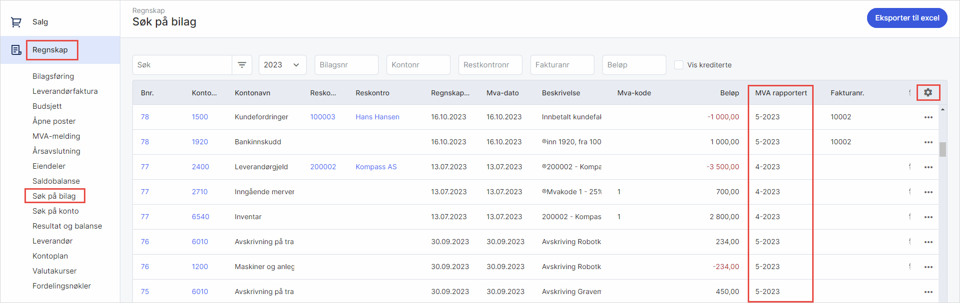 3. Søk etter aktuelt bilag for å se i hvilken periode det er blitt mva-rapportert. Listen kan også sorteres ved å klikke én gang på kolonnens overskrift.